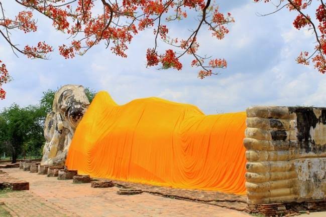 วัดโลกยสุธาราม สันนิษฐานว่าได้สร้างขึ้นในสมัยกรุงศรีอยุธยาตอนกลาง ในรัชสมัยสมเด็จพระนครินทราธิราช พระราชบิดาเจ้าสามพระยา ราว พ.ศ. 1995 วัดนี้มีพระพุทธไสยาสน์ ปางไสยาสน์ ที่ใหญ่ที่สุดในเกาะเมืองอยุธยา ประดิษฐานอยู่กลางแจ้ง ก่ออิฐถือปูน มีความยาว 42 เมตร และสูง 8 เมตร พระพักตร์หันไปทางทิศเหนือ ที่พระเศียรมีดอกบัวรองรับ พระบาทซ้อนกันเป็นมุมฉาก นิ้วพระบาทยาวเท่ากัน มีดอกบัวเกยซ้อนรองรับพระเศียรแทนพระเขนย สันนิษฐานว่าแต่เดิมเป็นพระพุทธรูปไม่ทรงเครื่อง แต่การบูรณะใน พ.ศ. 2499 คงมีการแก้พระเศียรเป็นอย่างพระพุทธรูปทรงเครื่อง รอบองค์พระมีเสาอิฐ 8 เหลี่ยม รวม 24 ต้น ซึ่งแต่เดิมคงจะมีการสร้างวิหารครอบพระพุทธไสยาสน์ แต่ไม่ปรากฏหลักฐานว่าได้พังทลายลงเมื่อใด